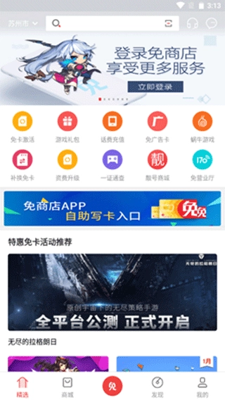 1、第一步,我们打开免商店app。进入首页后,不仅能够进行账单查询、话费充值、补换免卡等操作,还能领取海量游戏礼包。