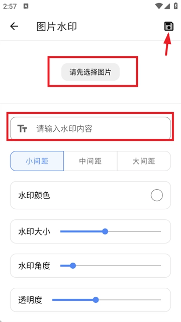 3、导入图片,在输入水印文字信息之后,点击右上角的按钮进行保存。