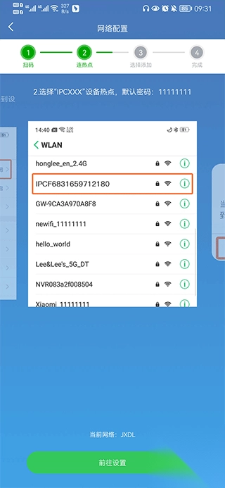 三、根据提示,先将手机连接到以IPC开头的设备热点(该设备热点的默认密码是11111111),之后便可连接设备。