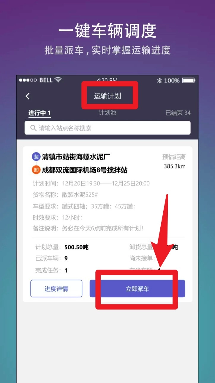 3. 成功登录后,点击「运输计划」,查看待派车辆以及任务明细,点击底部按钮就能完成派车操作。
