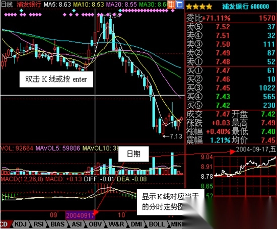 只需在K线图的某根K线上双击鼠标,或者将光标移至某根K线上,右下角的分时走势窗口便会显示相应日期的分时走势,让您能便捷查看历史分时走势。