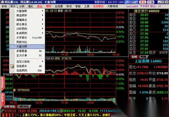 大盘对照页面同时显示某一商品的实时走势图与大盘指数的实时走势图。您可以通过点击“分析”菜单下的“大盘对照”选项调出该页面。