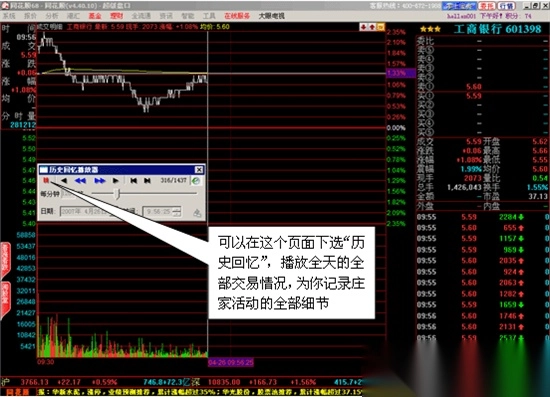 您还可以将此功能与“智能”菜单里面的“历史回忆”功能结合起来使用,通过选择日期来为您全面重现历史上任意一天的盘中走势。