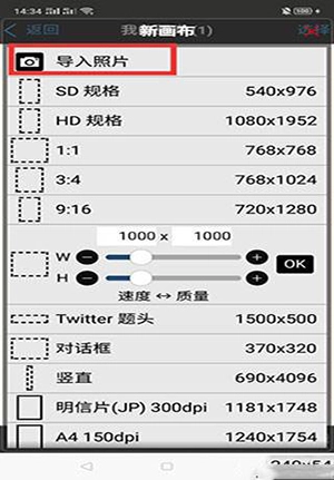 2、在新建画布处,选择导入照片。