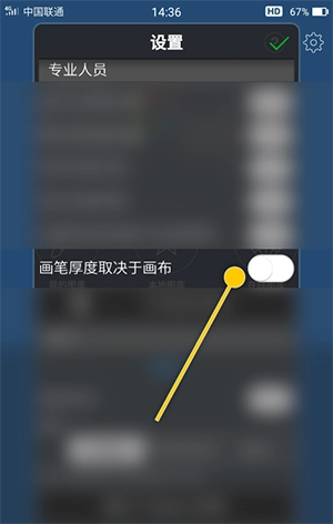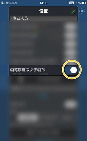 2、在“设置”界面中,勾选“画笔厚度取决于画布”选项的勾选开关。