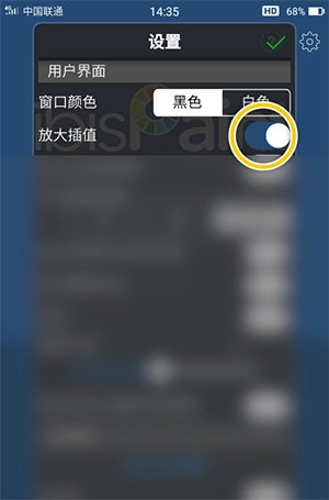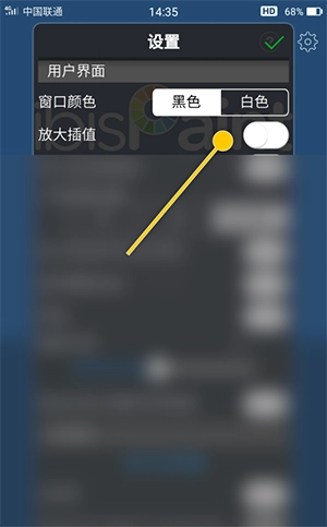 2、在“设置”界面中,勾选“放大插值”选项的勾选开关。