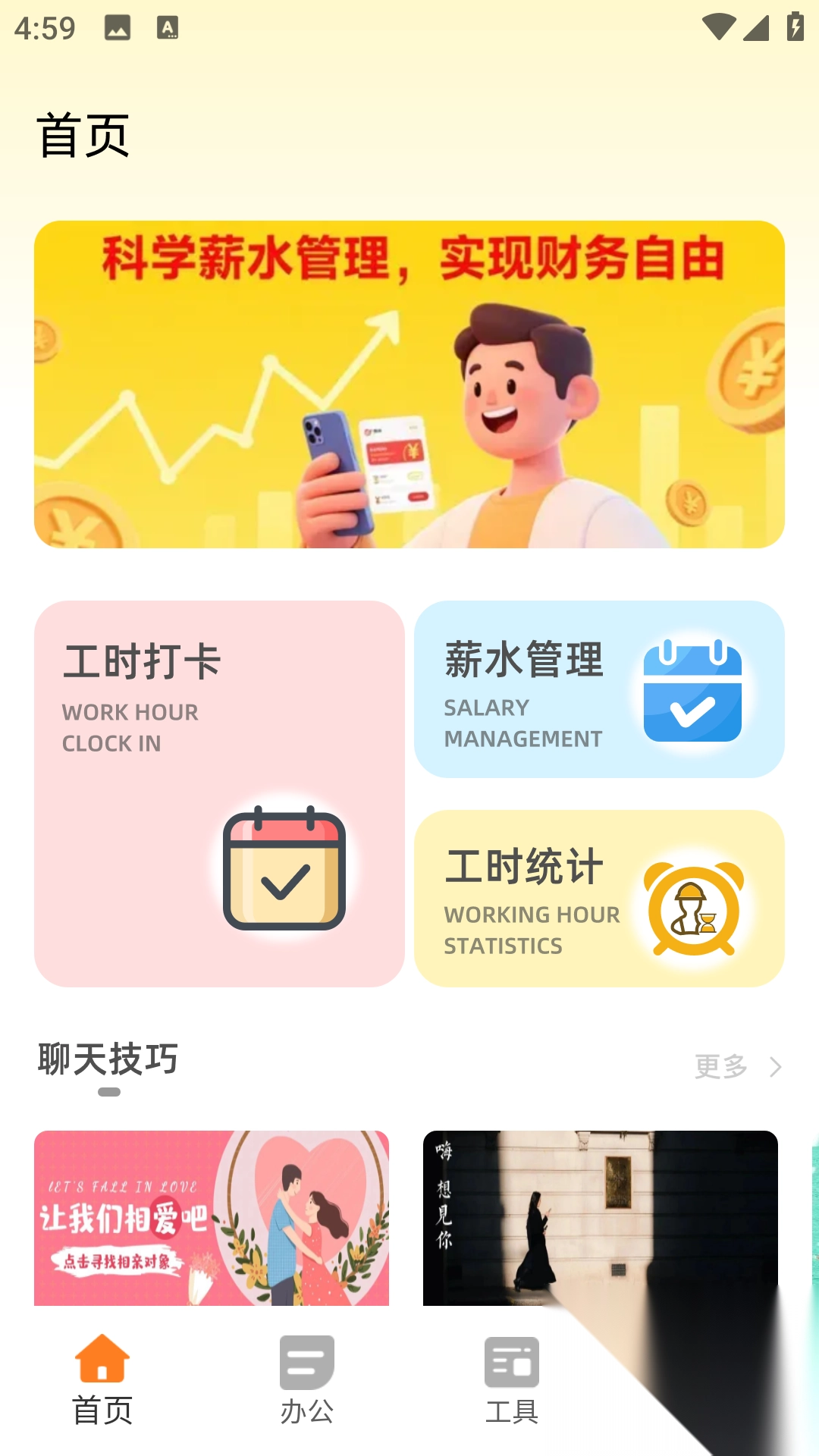 2、首页可以看到工时统计、薪水管理、工时打卡等多个板块;