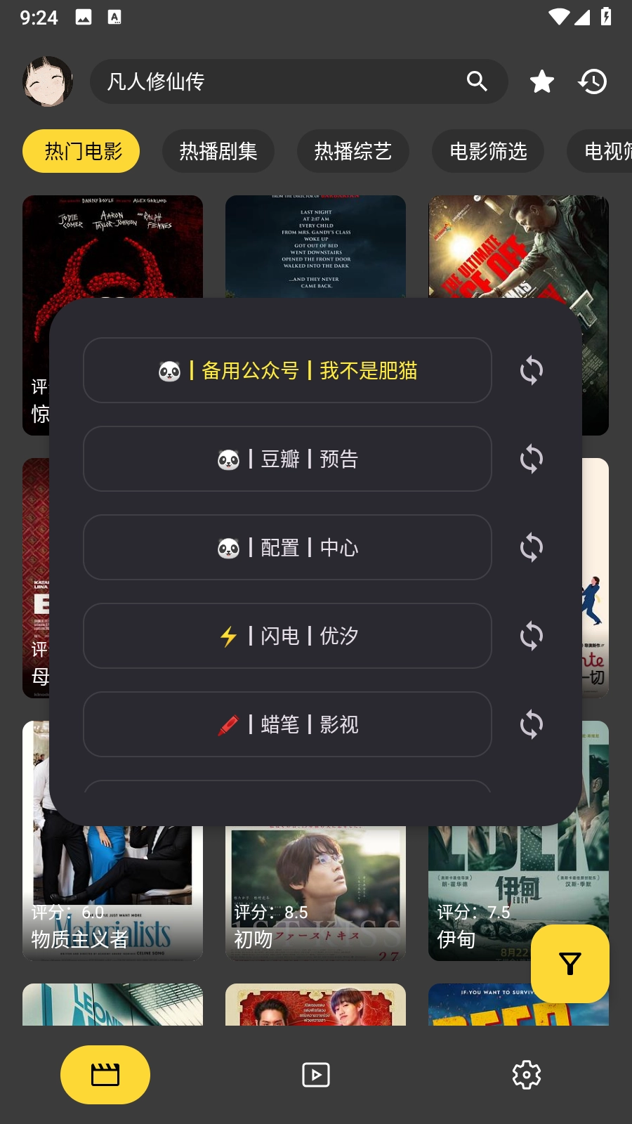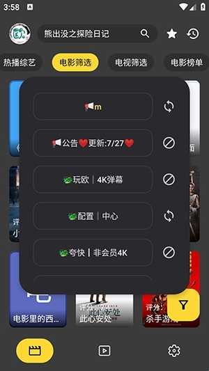 4. 等待App完成刷新,回到首页后点击左上角,此时就能看到众多影视源地址,可自由切换进行观看。