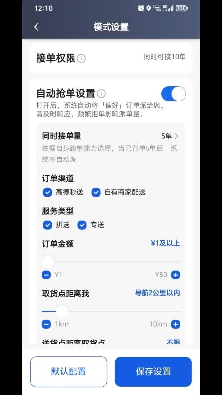 提供有模式设置功能,可以对你的接单模式需求条件进行自定义设置接单使用。