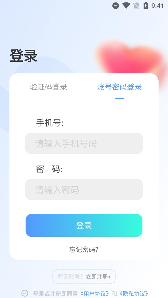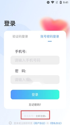在登录界面点击下方的没有账号,立即注册功能。