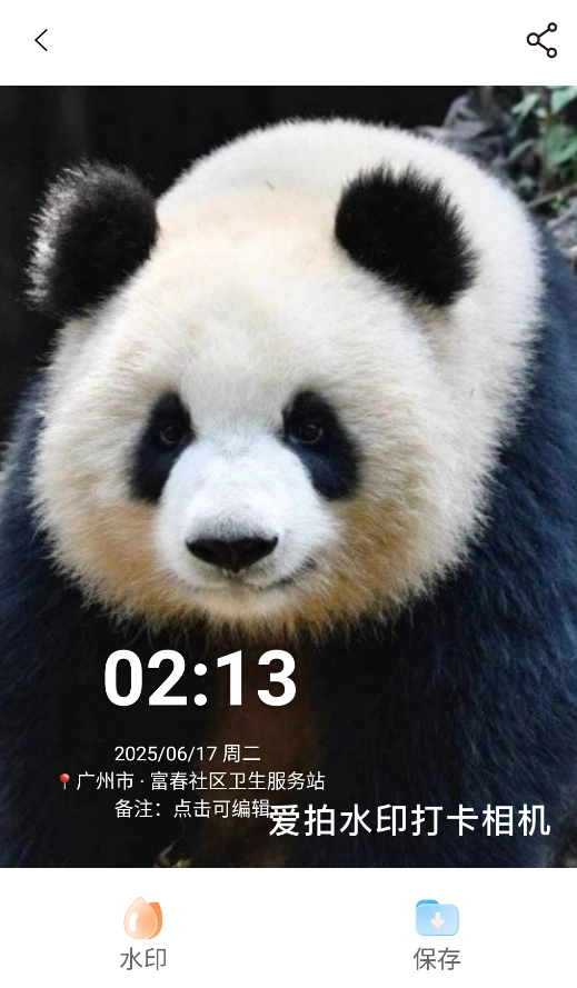 3、拍摄后照片自动添加包含时间、地点的水印,也可手动调整水印位置和透明度。