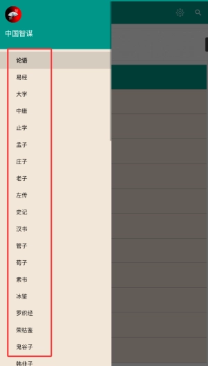 1、进入中国智谋APP后,点击阅读界面左上角的目录图标,展开书籍选择菜单。
