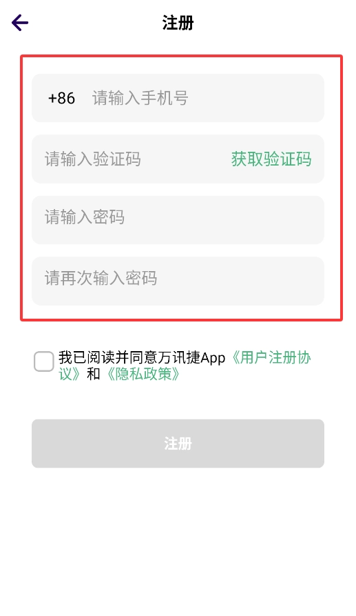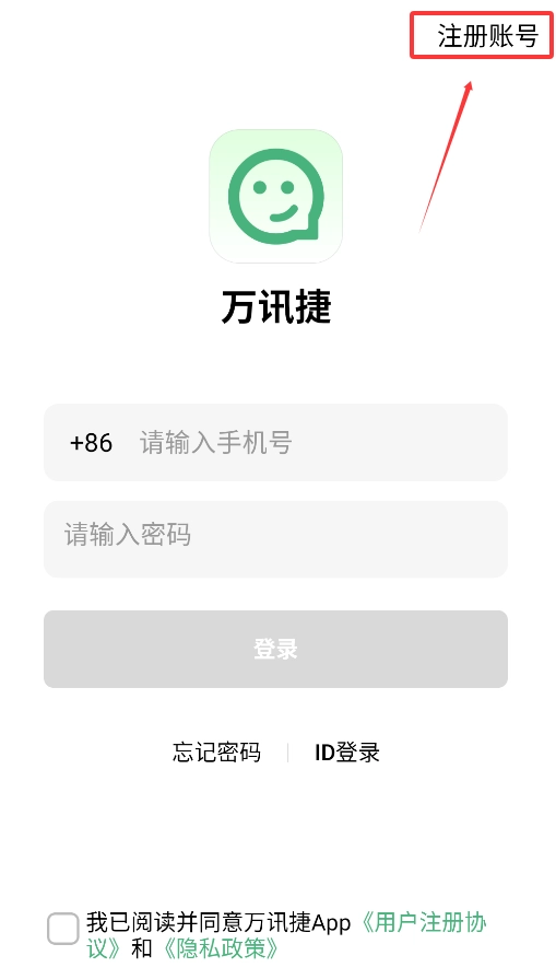 1、启动APP后,在登录页面点击"注册账号"按钮,进入账号创建流程。
