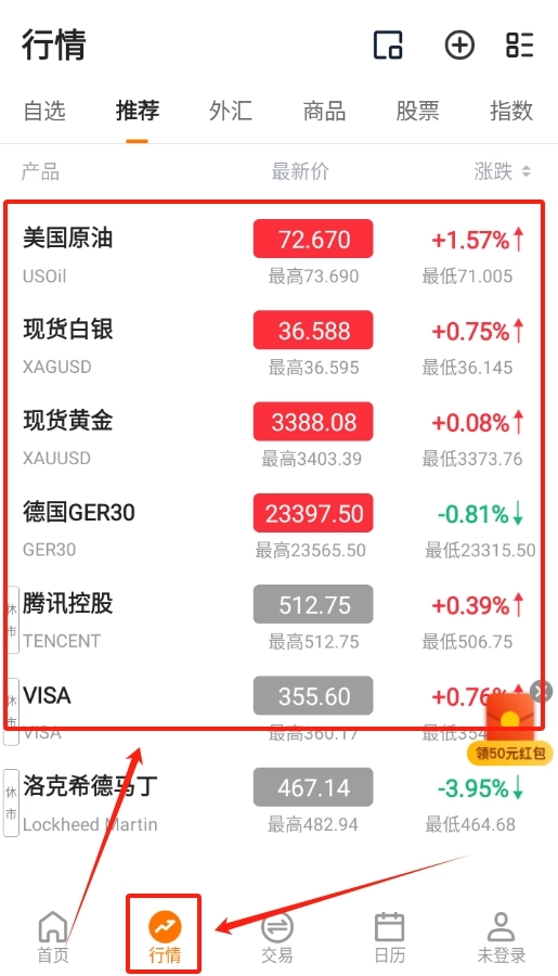 1、打开软件进首页,能看到股票的大致行情,像涨跌情况和价格走势都有显示。