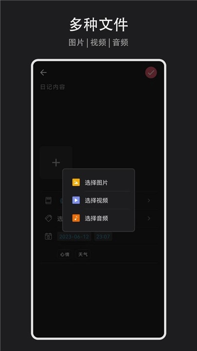 2. 天气与心情记录:于编辑界面点击选择天气或心情图标,以可视化方式展现当日状态。