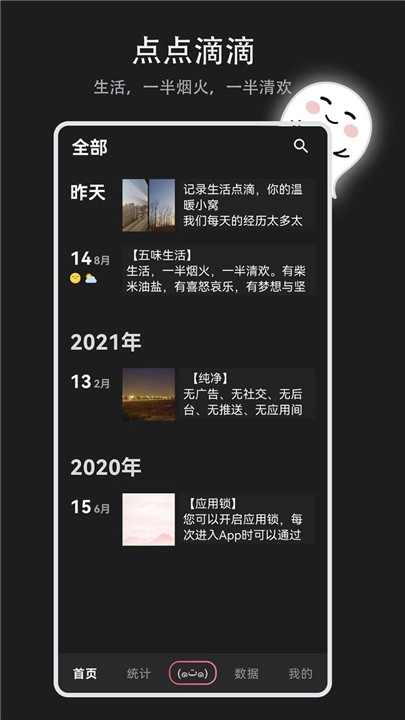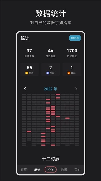 4、数据统计:可查看记录频率、日记数量、标签分布等多维统计图表。