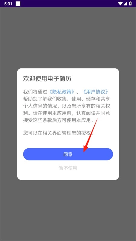 1、打开进入电子简历中,同意用户协议以继续使用。