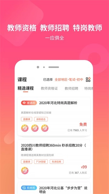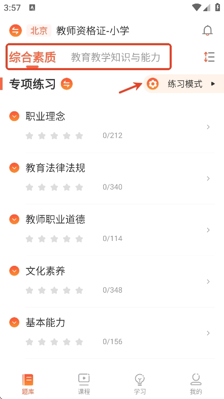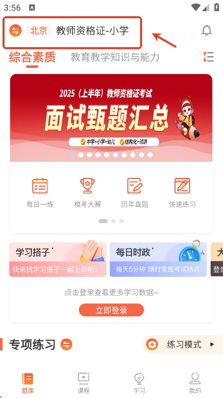 1、用户打开app后,首先要选择考试地区与考试科目,比如像下图中所示的北京地区,以及小学教师资格证这一科目。