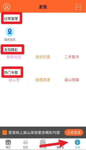 5、在“发现”页面,你能够便捷访问日常管理板块、精彩内容板块以及专题活动板块,进而全方位知悉梁山本地最新的热点资讯与优惠信息。