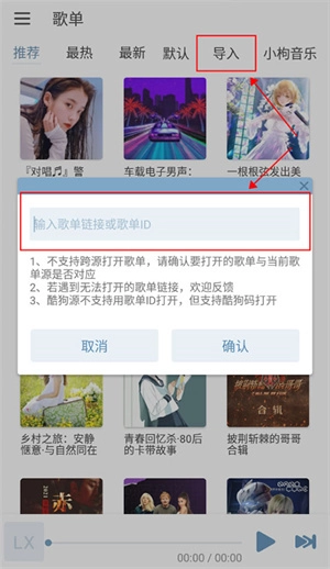 3、在此处点击“导入”,输入歌单链接及ID,即可完成歌单导入。