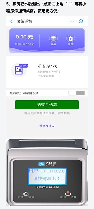 5、通过按键取水完毕后,可选择点击机器上的退出按钮,也可以在app上选择结束并进行结算。