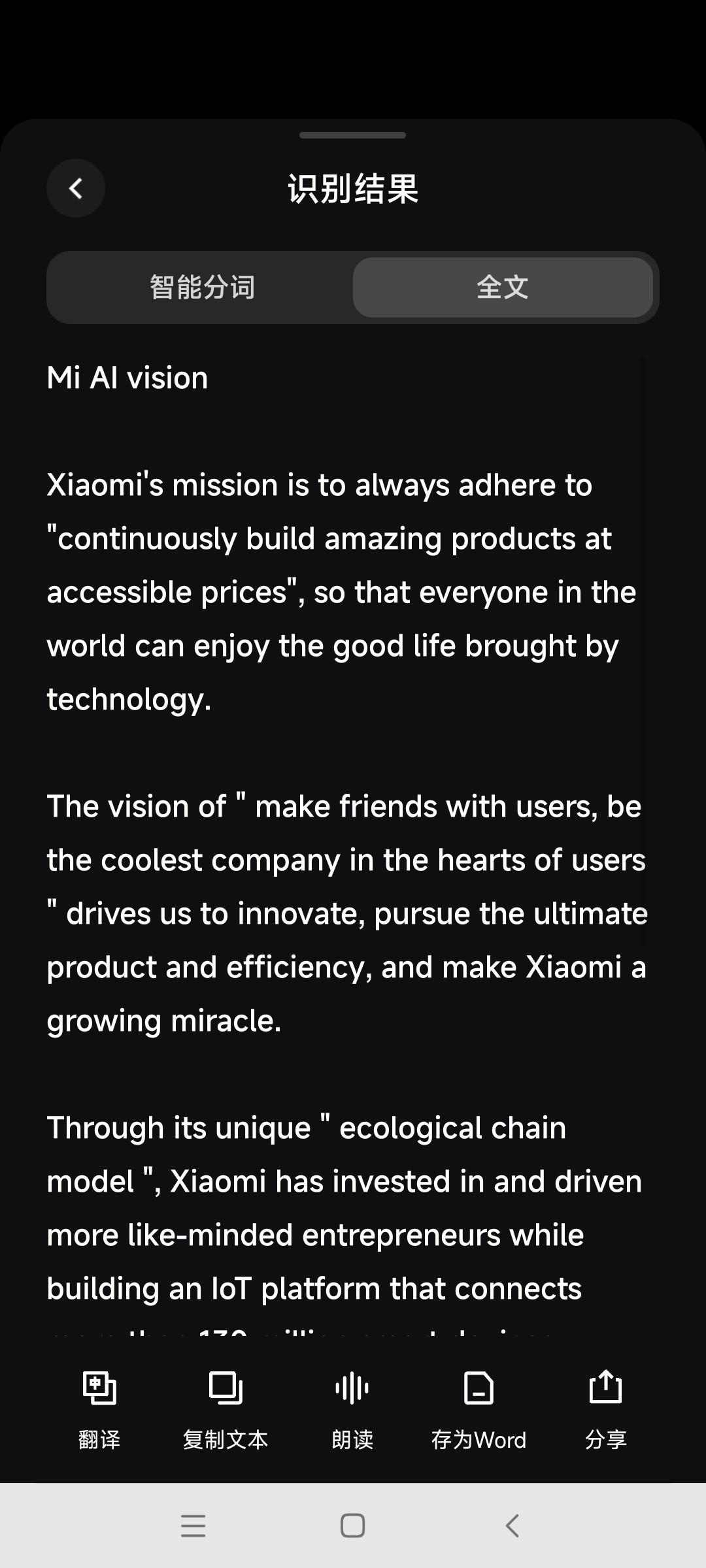 3、轻点“识文字”,即可提取文字,不仅能一键复制,还可导出为Word文档,即便处于无网络状态也能正常使用。