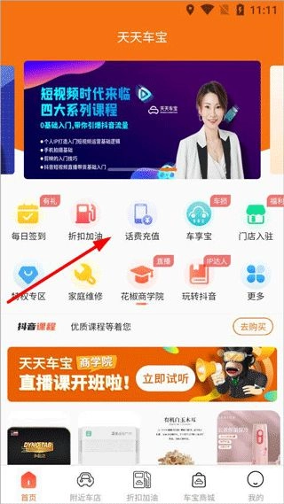 1. 开启天天车宝app,其界面包含首页、附近车店、折扣加油、车宝商城以及我的等版块,其中首页具备基础功能。