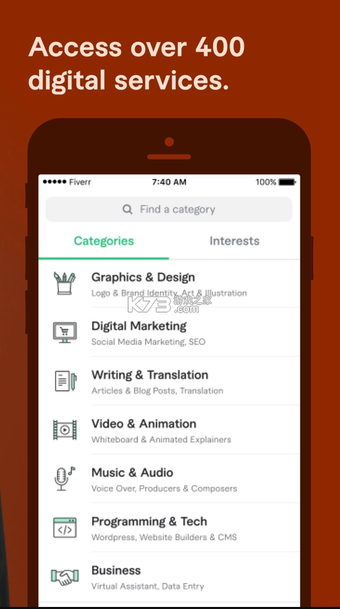 Fiverr是一款覆盖全球的兼职平台,专为自由职业者打造,提供海量兼职机遇。在这里,能依据你的职业技能迅速实现智能匹配,轻松找到契合自身的兼职工作。平台的工作机会广泛且多样,涵盖翻译、音乐、写作、编辑校对、数字营销以及编程等众多领域,无论你擅长什么,总有一款适合你。心动不如行动,快来下载体验吧!