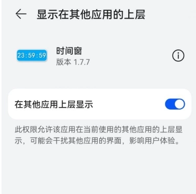 2、将“允许显示在其他应用的上层”的按钮滑动至右边“开启”位置,桌面便会出现时间窗。