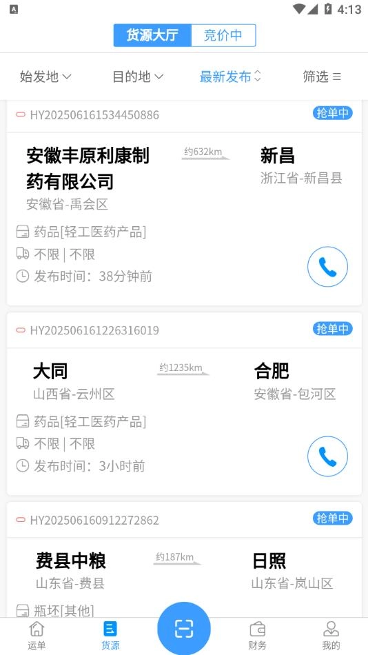 1. 于货源大厅查看处于竞价中的货源以及最新发布的货源,全面掌握货源的详细信息,涵盖货物名称、运输距离、运费等内容。