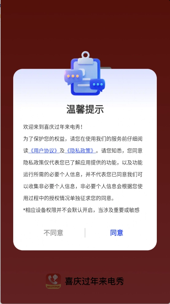 1、第一步,在本站下载喜庆过年来电秀app。下载完成后,认真阅读并同意隐私政策与用户协议,随后进入首页。
