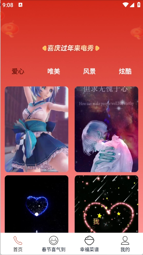 过年就用喜庆过年来电秀APP!这里集合了各种风格的来电秀视频,酷炫动感的、唯美梦幻的、温馨爱心的……应有尽有,并且通通免费,随意挑选!APP融入大量年味元素,能让你的来电界面立刻焕然一新,凸显独特个性。资源库紧紧追随时尚潮流,持续更新,保证你的手机屏幕始终洋溢着浓厚的新年欢乐氛围。赶紧来定制专属于你的新年来电秀吧!