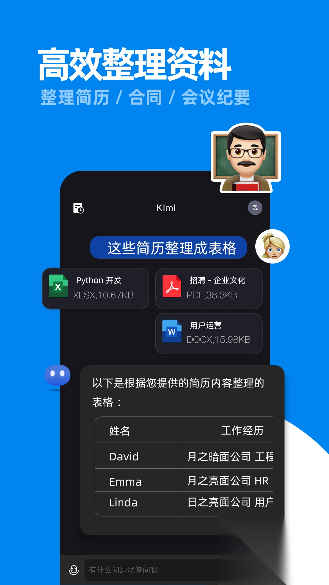 4. 资料整理:不管是堆积成山的发票,亦或是复杂冗长的会议记录,Kimi 皆可实现智能识别与整理,自动提炼出关键点,使得资料整理不再繁杂,信息清晰直观。