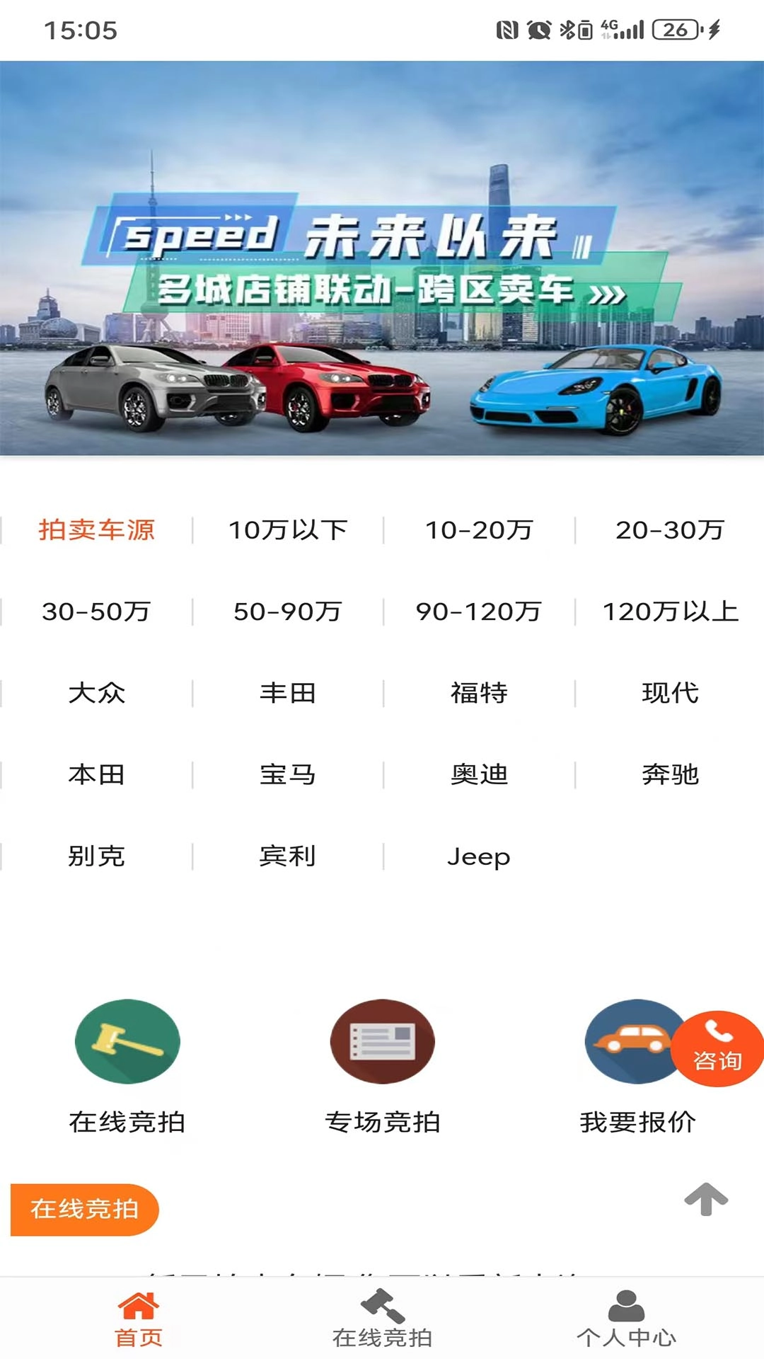1. 浏览众多拍卖车源,依据品牌、价格区间等条件,查询自己感兴趣的车辆。