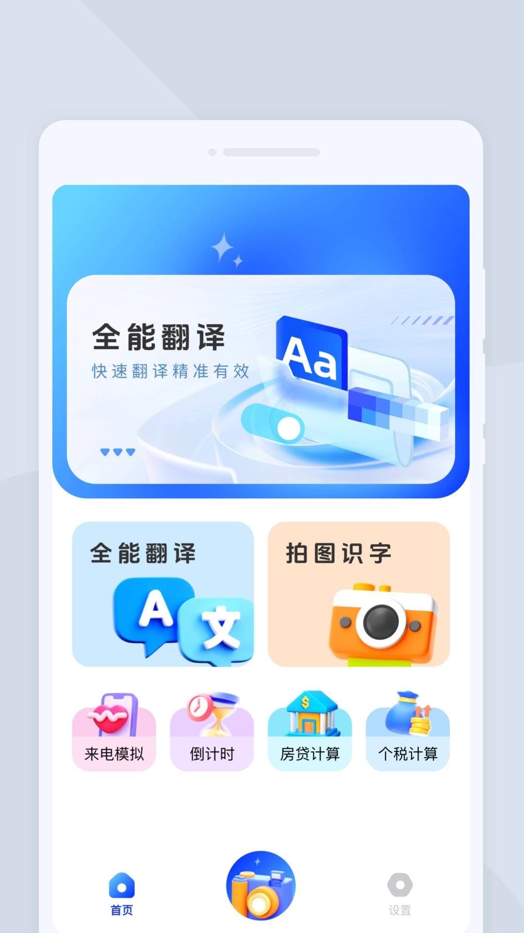 1、在首页点击【全能翻译】,感受精准翻译;也可以使用【拍图识字】,还能够尝试【来电模拟】等工具。