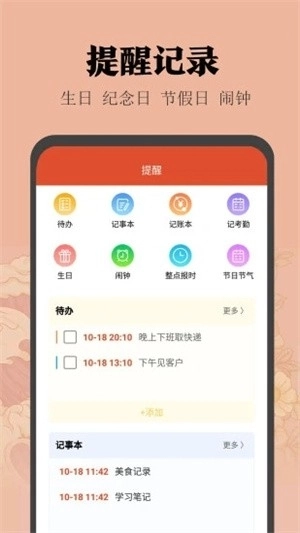 界面设计简约且令人倍感舒适,极大地方便了用户的日常生活。它不仅能够支持用户记录各类重要事项,合理规划每日工作,还会贴心提供星座与黄历相关信息。