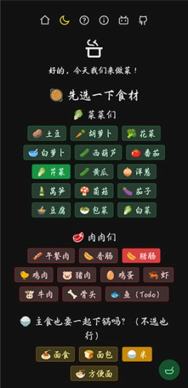 2、进入页面后选择想要烹饪的食材、厨具;