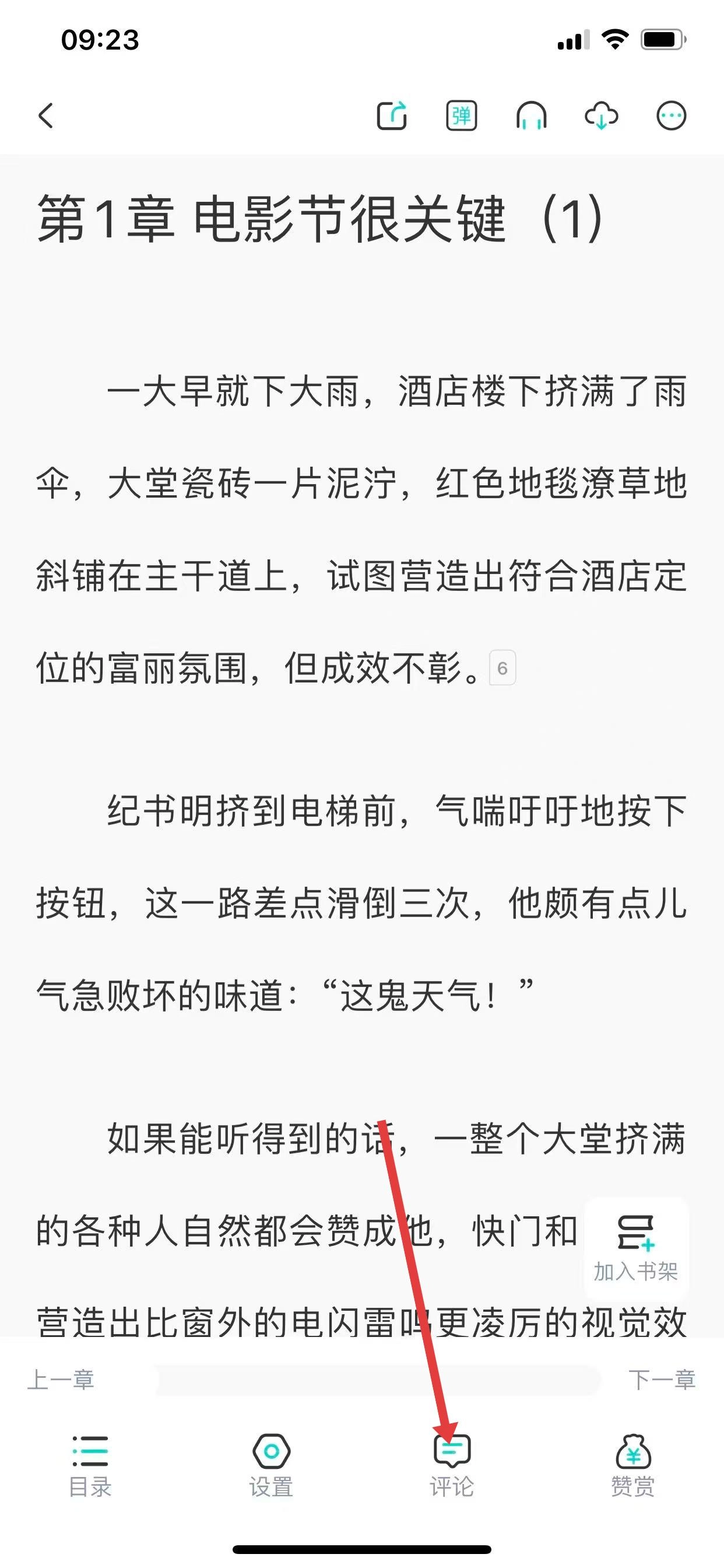 2. 来到阅读界面,寻找到评论图标并进行点击操作,进而打开评论窗口。