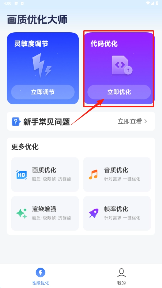 1. 开启画质优化大师应用程序,轻点代码优化板块里的立即优化按键,随即进入代码操作页面。