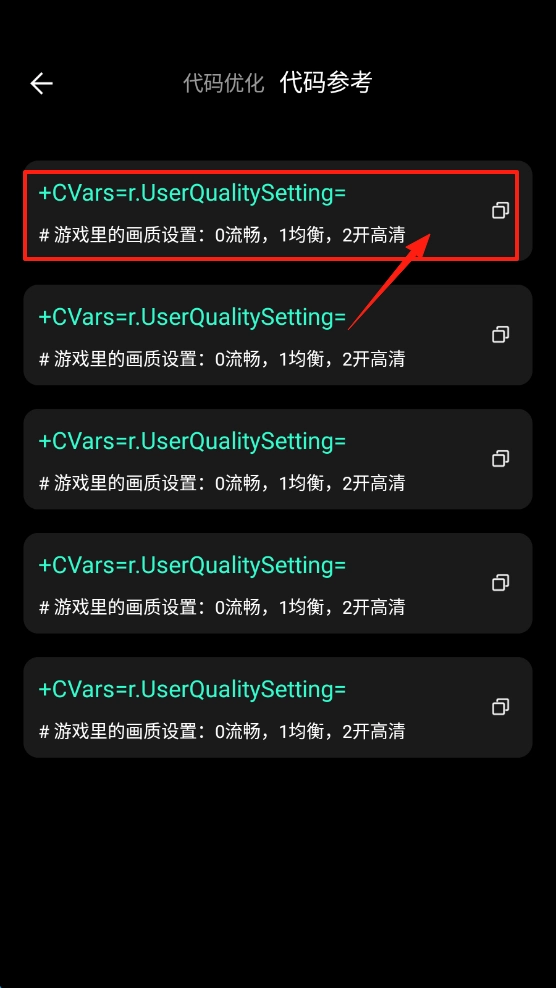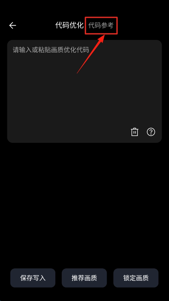 2. 在代码优化页面中,点击顶端的代码参考选项,即可查看可用的画质代码。