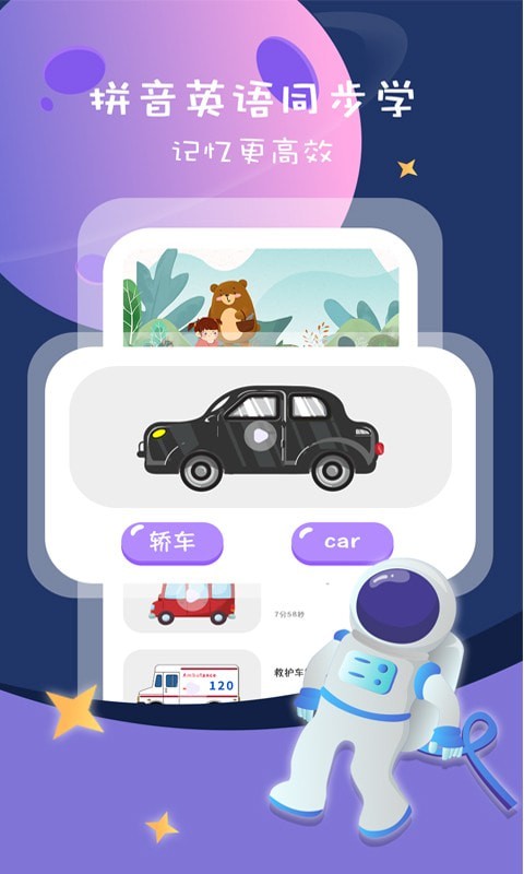 3、是一款宝宝初期学习工具软件。通过看图片识别文字和物体,这里有非常丰富和形象的文字介绍和学习界面。