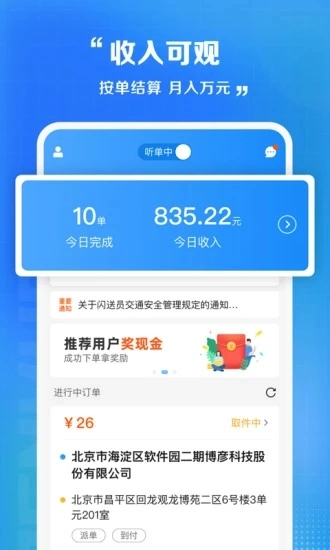 我们拥有完善的权益保障体系,全方位层层守护你的权益。订单24小时不间断推送,让你随时都有单可接。而且,若是你负责夜间订单配送,还会有额外补助。在这里,全民皆可参与赚钱,人人都有机会成为闪送员,轻松开启创富之路。