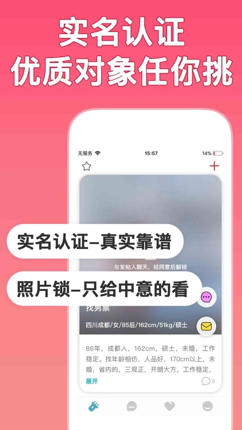 【征友广场】于“征友广场”内,你所发布交友信息里的个人照片,仅你许可查看的人方可解锁查看,无需担忧会被熟人瞧见而产生尴尬。