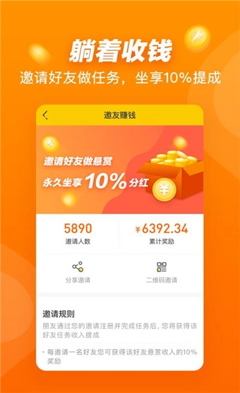 3、邀请好友可获现金奖励,与好友一同参与悬赏任务,奖励多多。此外,赏金游戏和比赛更是能让你赚得盆满钵满!