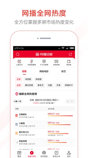 3. 实时电视收视情况:涵盖实时关注度、实时市场占有率等各类电视收视数据。
