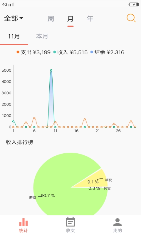 4. 轻点“报表分析”按钮,便能查看自身财务状况,知悉个人收入、支出以及结余情形。