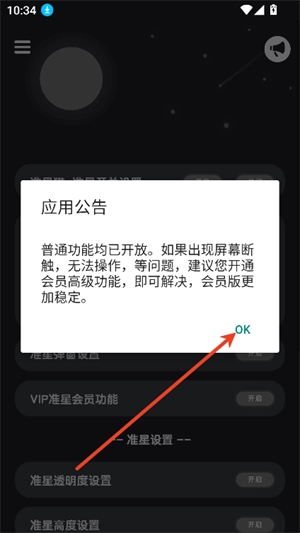2. 点击“ok”,接着点击开启准星开关。