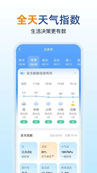 5、运动健身锻炼方面:为您提供紫外线、风速、体感温度等专业数据,帮助您科学地规划运动项目与时间。