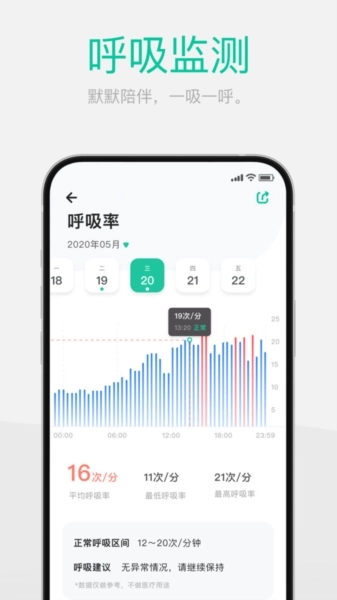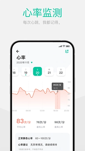 3、既能够依据时间段查看历史健康数据,又以图表形式呈现了每分钟数据的变化情况。