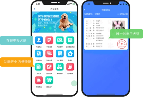 通过在线方式申请办理犬证,随后等待政府相关人员进行审核,审核通过后即可领取合格的电子犬证。同时,还能够实时了解违规记录、养犬所涉及的法律法规、禁入区域、免疫点、办证点以及禁养犬只等各类信息。